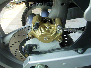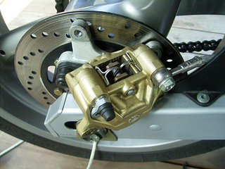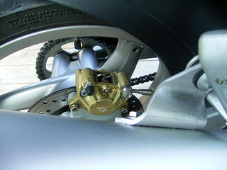 リア・ブレーキです。ブレーキ・キャリパーはブレンボの通称カニです。なんともう一台の所有スクーターであるX9-250のブレーキと同じです。スクータのX9-250にはフロントにもリアにもカニがついています。 250ccのスクータのリア・ブレーキと992ccのバイクのリア・ブレーキが同じなんだと妙に感心しました。 |