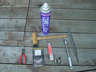 使った道具類です。六角レンチ、ハンマー、ラジオ・ペンチ、ヤスリ、パッド・グリス、パーツ・クリーナなどを使いました。 |
